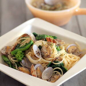 フライパンにオリーブオイル、にんにく、あさりを入れ中火で炒め、香りが立ったら白ワインを加えてひと煮立ちさせ、フタをする。