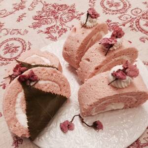 焼き上がった生地が完全に冷めたら、オーブンシートをはがし、桜風味のシロップをうつ。