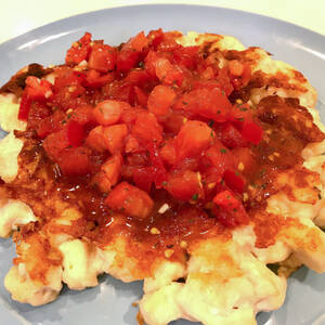 焼き色がついたら裏返して3〜4分加熱する。裏返して器に盛って<1>のトマトソースをかける。