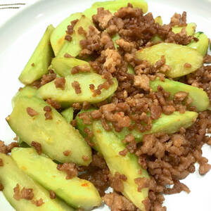 アスパラは根本と袴を落として、1分30秒ほどゆでて粗熱を取り、1cm幅の斜め切りにする。ガリは細切りにする。