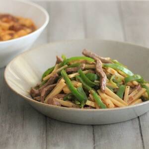 たけのこは縦に薄切りにしてから、ピーマン同様に繊維に沿って6〜7mmの細切りにする。