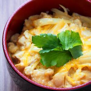 丼にご飯をよそい、4を滑らせるようにのせ、ざく切りにした三つ葉をあしらう。