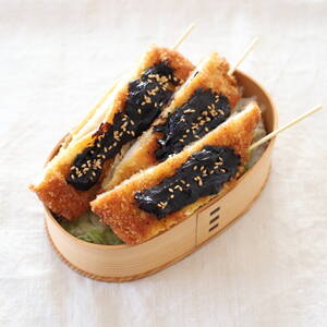 お弁当箱にご飯を詰めて、粗熱が取れたら、4をしき、3を盛り付けて、1を塗り、白ごまを散らして出来上がり。