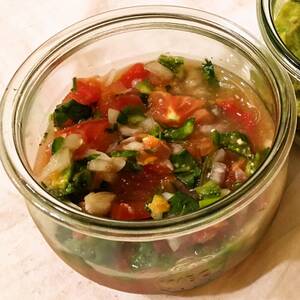 トマトを~1.5cm角を目安に粗みじん切りにする。玉ねぎはみじん切りにする。