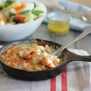 器にちぎったレタス、1〜4の野菜、ちぎったアンチョビ、ツナをのせ、ドレッシングをかける。