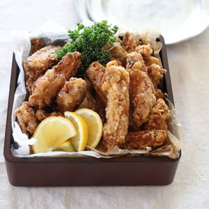 手羽先の先の部分を切り、骨の間に切り込みを入れて、半分にする。