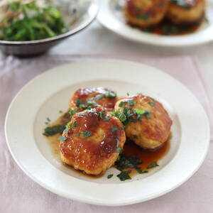 梅干しを入れてさっと煮絡めたら、器に盛り付けて、大葉を散らして出来上がり。