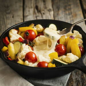 カマンベールチーズのトップを切り取り、野菜をチーズにつけながら食べる。