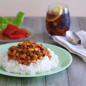 カレー粉を加えて炒めたら、ホールトマト、ミックスビーンズ、みそ、水を加え、かき回しながらぽってりするまで煮る。