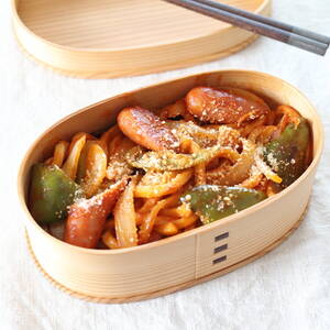 ウインナーは、斜め2等分にする。玉ねぎはくし形に切る。ピーマンは種とヘタを取り除き、斜め2等分に切る。