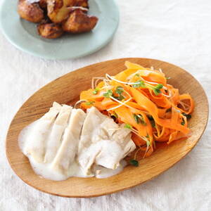 【B】とヨーグルト、鶏肉のゆで汁を加えて、混ぜる。