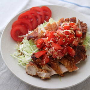 皿に千切りキャベツを盛る。4を食べやすく切ってのせ、薄切りトマトを添え、Bをかける。