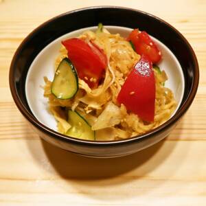 【アレンジ1】 冷やし中華風:きゅうりせん切り1本分/錦糸卵 卵2個分/ハムせん切り2枚分/トマト1個/緑豆春雨20g