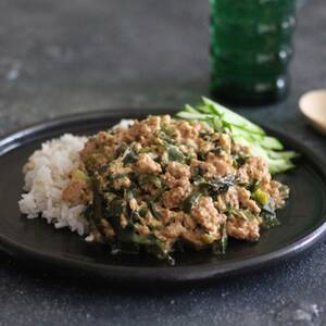器によそったごはんの上に盛りつけ、せん切りきゅうりを添える。