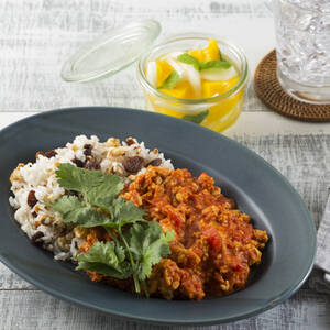 皿に7のごはん、5のカレーを盛り、お好みでパクチーを飾る。