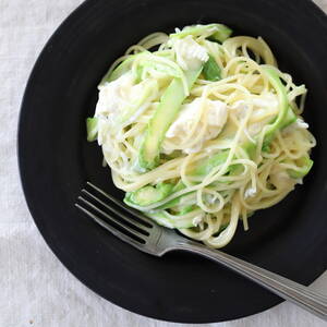 チーズの入ったボールにスパゲッティーとアスパラガスを加えて混ぜる。味見をして、パスタの茹で汁か塩で味を整える。
