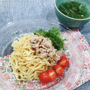 皿に<7>を盛り、<3>のひき肉と<6>の水菜、ミニトマトを飾り、<4>のタレをかける。