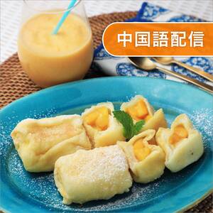 ジップ付きの袋にマンゴー(熟したもの)をカットし、牛乳、烏龍茶を入れる。材料が混ざるように揉み込む。