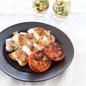温めたフライパンにオリーブ油を入れて、鶏肉の皮目を下にして、入れる。トマトも断面を下にして中火で5分ほど焼く。