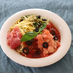 味見をして、塩、こしょう、バルサミコ酢をそれぞれ加えて、味を整える。