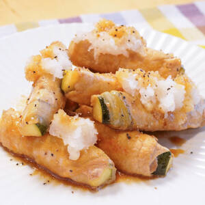 <1>のズッキーニに豚肉を斜めにきつく巻きつけ、塩こしょうを振る。