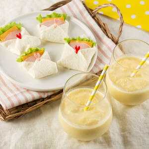 <1>を手でほぐれるまでもみ、ヨーグルトを加えて混ぜる。牛乳を少しずつ入れて程よい濃さまでのばしグラスに注ぐ。