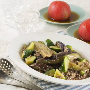 フライパンの底から1cmくらいの高さまでサラダ油(分量外)を熱し、なすを加えてしんなりするまで揚げ焼きにして取り出す。