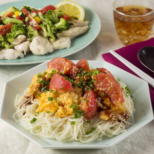 全ての野菜を【ドレッシング】で和え、皿に盛りつけた鶏ささみの上に乗せる。飾りにレモンを添える。
