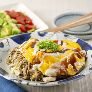 皿に5を盛り付け、卵をのせる。仕上げにお好みのソースをかけ完成!