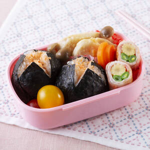<2>を半量ずつラップに包んで丸く握り、温かいうちに、のりを巻く。
