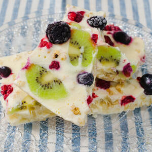 <5>を<4>のバットに平らになるように流し入れ、キウイ、冷凍ミックスベリーをトッピングする。
