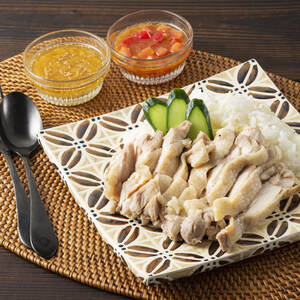 <3>の鶏肉を食べやすい大きさに切る。器にご飯を盛って鶏肉・野菜を盛り付けお好みのタレをかけて食べる。