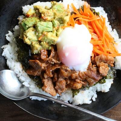 2を取り出し、食べやすい大きさに切り、ごはんの上にのせる。