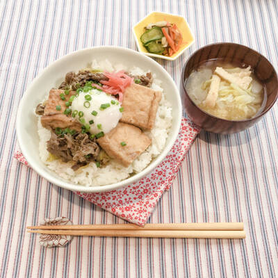 牛肉は食べやすい大きさに切る。容器に【A】の調味料を入れ、牛肉を入れ約10分程度漬け込む。