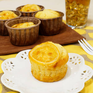 <8>を型に流し入れ、上に<4>のはちみつレモンを1枚ずつのせて180℃のオーブンで25分焼く。