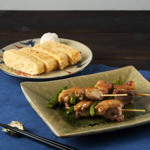 竹串に鶏肉を皮目を下にして、鶏肉、ししとうがらし、鶏肉、ししとうがらし、鶏肉の順に刺す。これを6本作る。