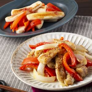 フライパンを火にかけてサラダ油(分量外)をひき、パプリカとはんぺんを入れて、焼き色がつくまで2分ほど炒める。