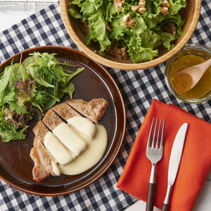 豚肉は筋を切って塩、粗びき黒こしょうをふり、茶こしで小麦粉をふってなじませる。
