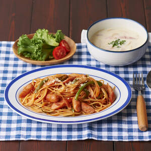 玉ねぎは半分に切って薄切りにする。ピーマンはほそ切りにする。ウィンナーは斜め切りにする。