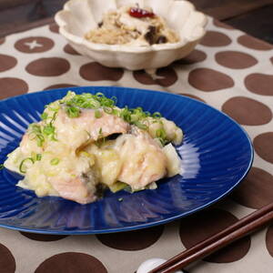 大きめの耐熱ボールにきのことにんにくと【A】を入れて混ぜる。ラップをせずに600wの電子レンジで5分加熱する。