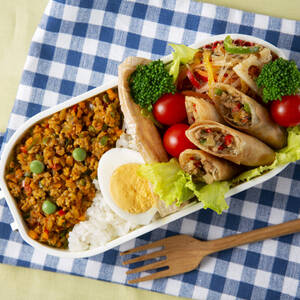 <1>の春雨と<2><3>でボイルした野菜の水分を拭き取り、ボウルに入れ混ぜる。