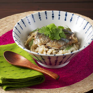 ボウルにごはん、<4>、いりごま、しょうがを混ぜて、【B】で味つけする。皿に盛り付け、さんまをのせ、薬味を散らす。