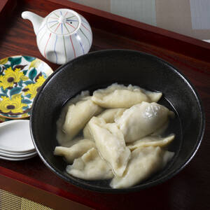 真ん中に餃子のタネを乗せて皮の周囲に水をつけて包む。