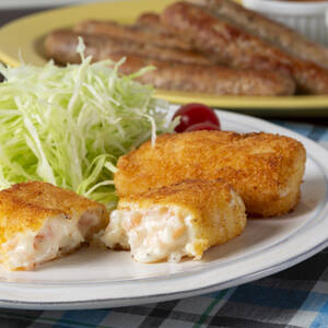 むき海老は粗く刻む。フライパンにサラダ油を引き、むき海老を加えて炒め、塩、胡椒をする。