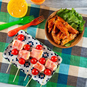 竹串にミニトマト→ベーコンをきつく巻いたカマンベールチーズ→ミニトマトの順にさす。