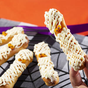 エクレアに飾り、その上にチョコペンで目玉をつけて完成。