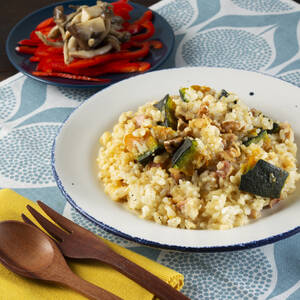 豆乳を加えてグツグツしてきたらご飯とキヌアを混ぜてものを入れ、煮詰める。
