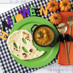 フライパンに生地を乗せ、指でオバケの目と口の位置に穴を開ける。中火にかけ、焼き色が付くまで7〜8分ほど焼く。