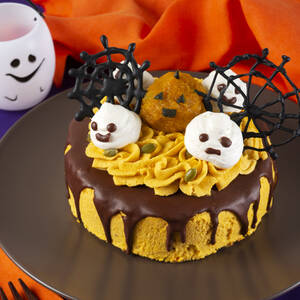 残りのかぼちゃクリームを絞り袋に入れ絞り、かぼちゃの種を飾る。