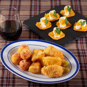 カマンベールチーズは6等分に切り、クラッカーの上にのせて、<5>を盛り付けて、イタリアンパセリを飾る。